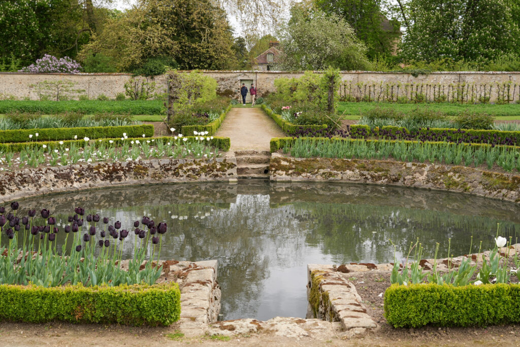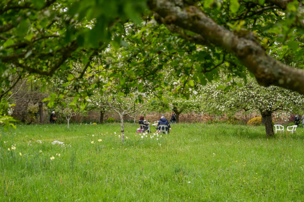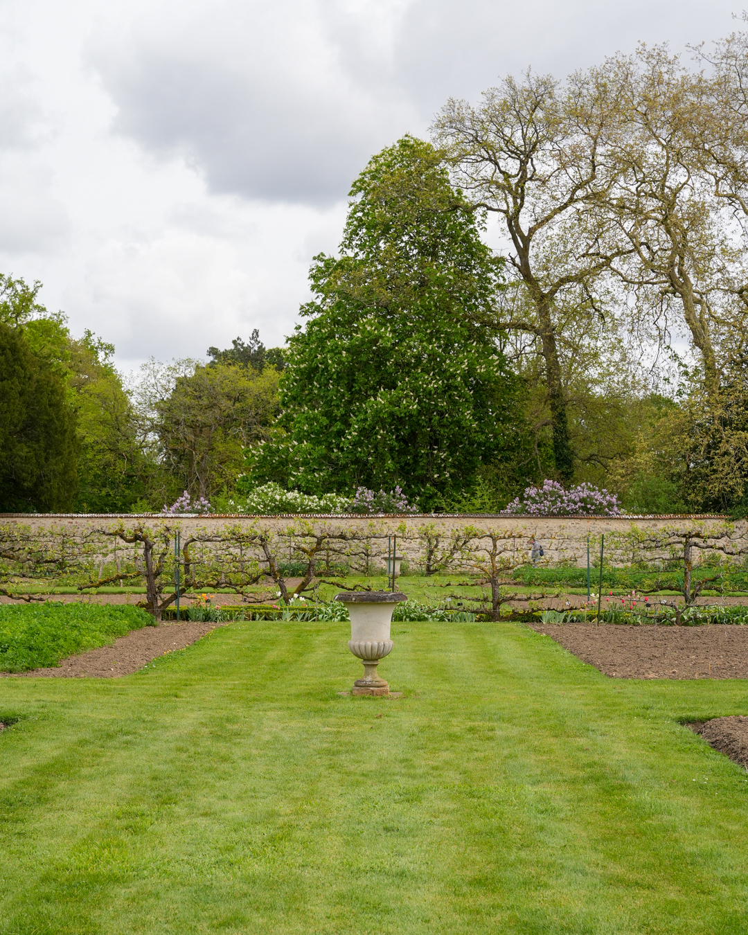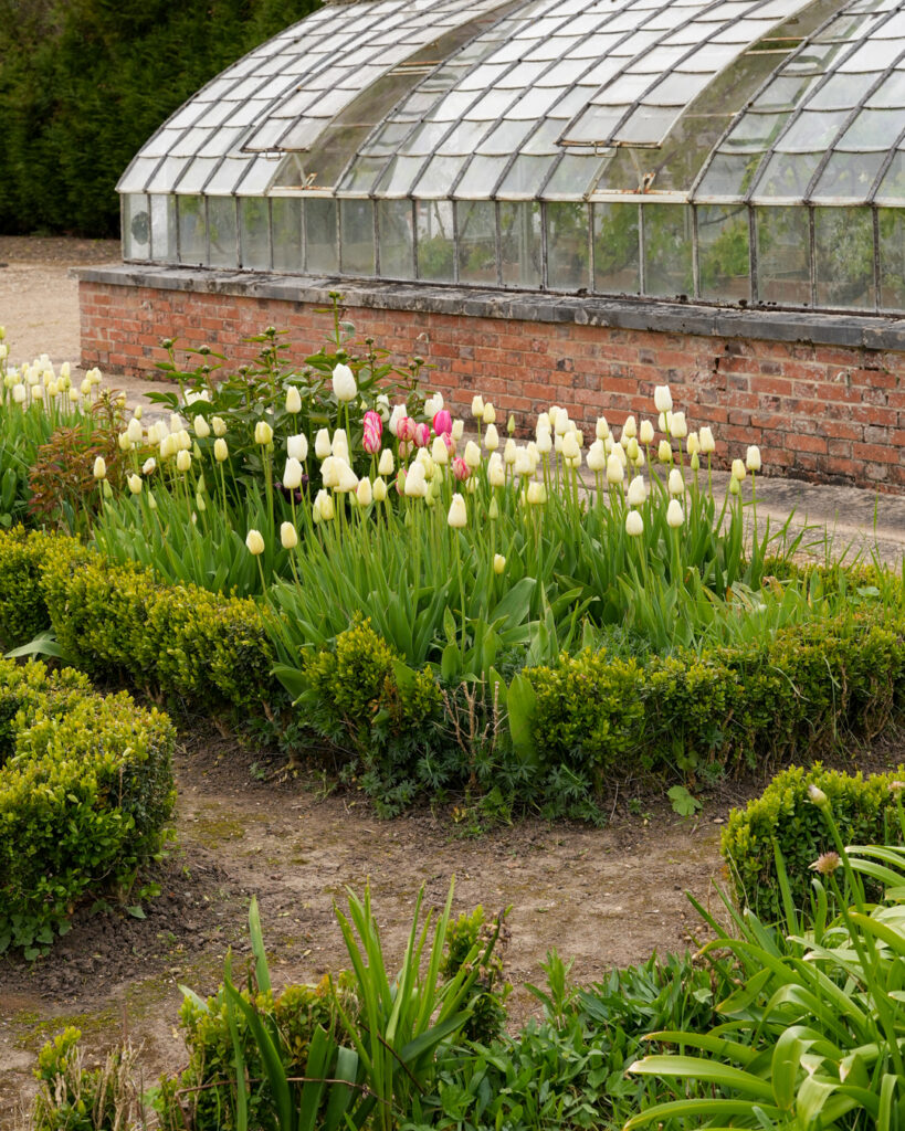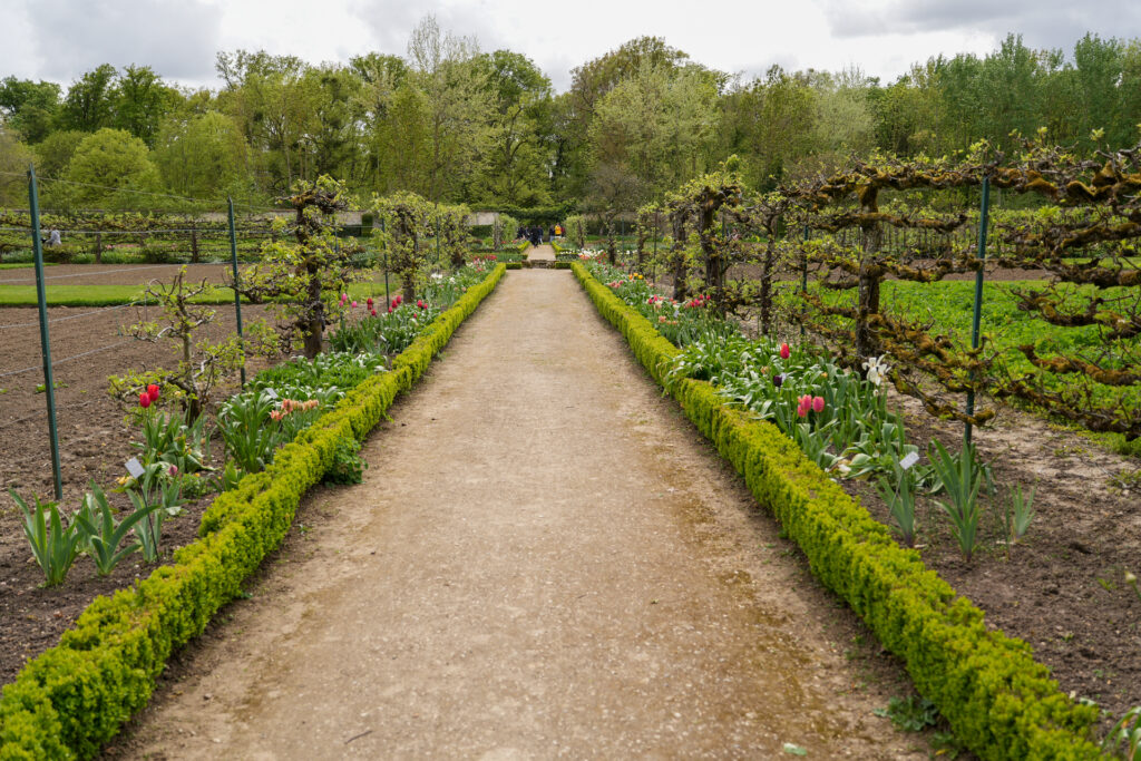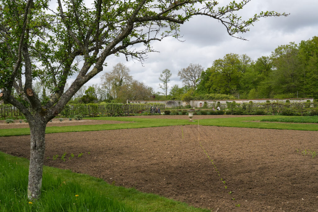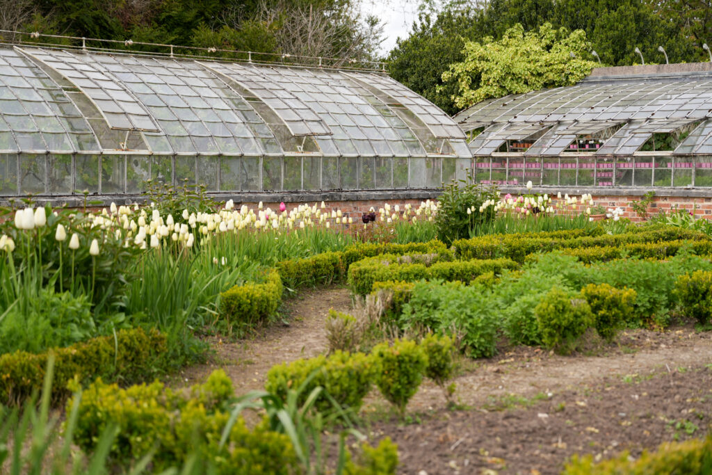 Les carrés de terre brune dominent le centre du potager tandis que les longues allées bordées de buis taillés se déploient avec une rigueur toute française, encadrées de tulipes aux pétales striées qui explosent dans toutes les nuances du rose, du corail et du blanc. Ce jardin remarquable semble vide en ce début de printemps, et pourtant, on aperçoit déjà les premières plantules qui s’éveillent à l’abri dans la serre victorienne aux vitrages blanchis. Elles sont la promesse de beaux légumes à venir. Le verger attenant est en pleine effervescence : les pommiers croulent sous leurs fleurs blanches, et certains visiteurs se sont attablés pour se reposer sous les branches, loin de la foule venue arpenter les allées du château à la recherche de plantes rares et exceptionnelles.