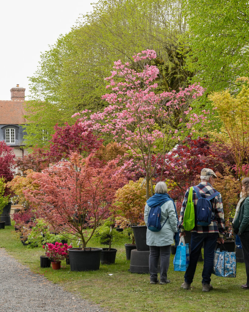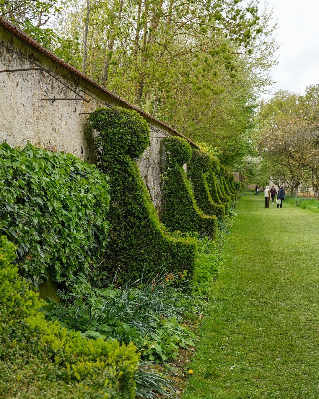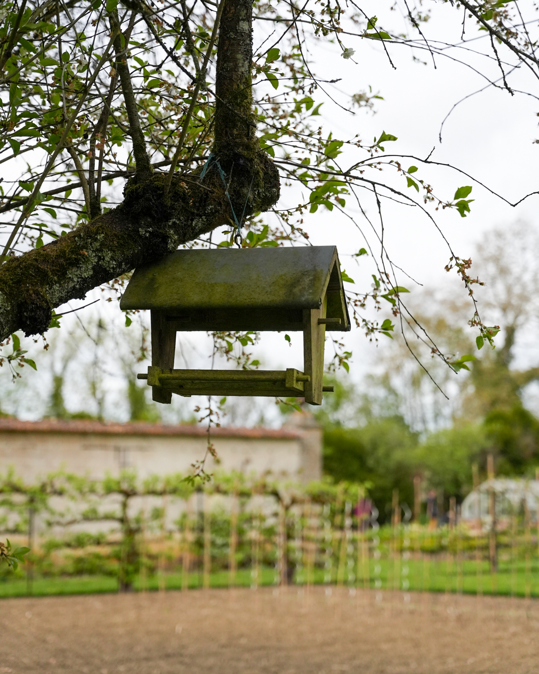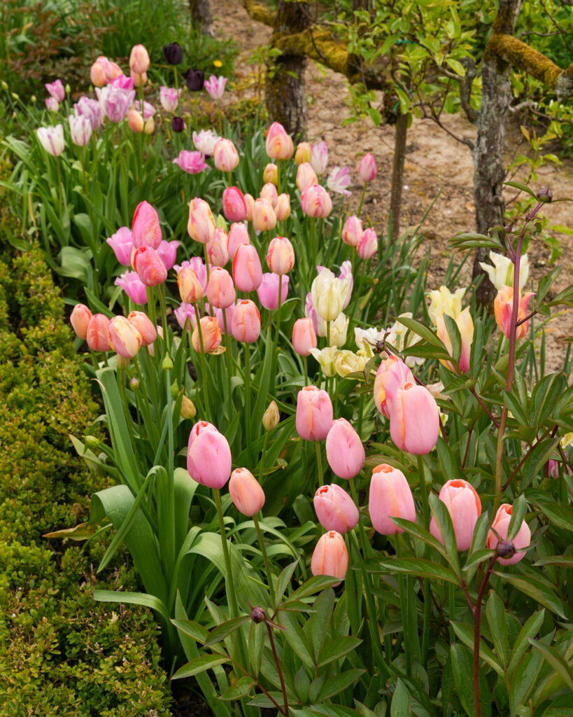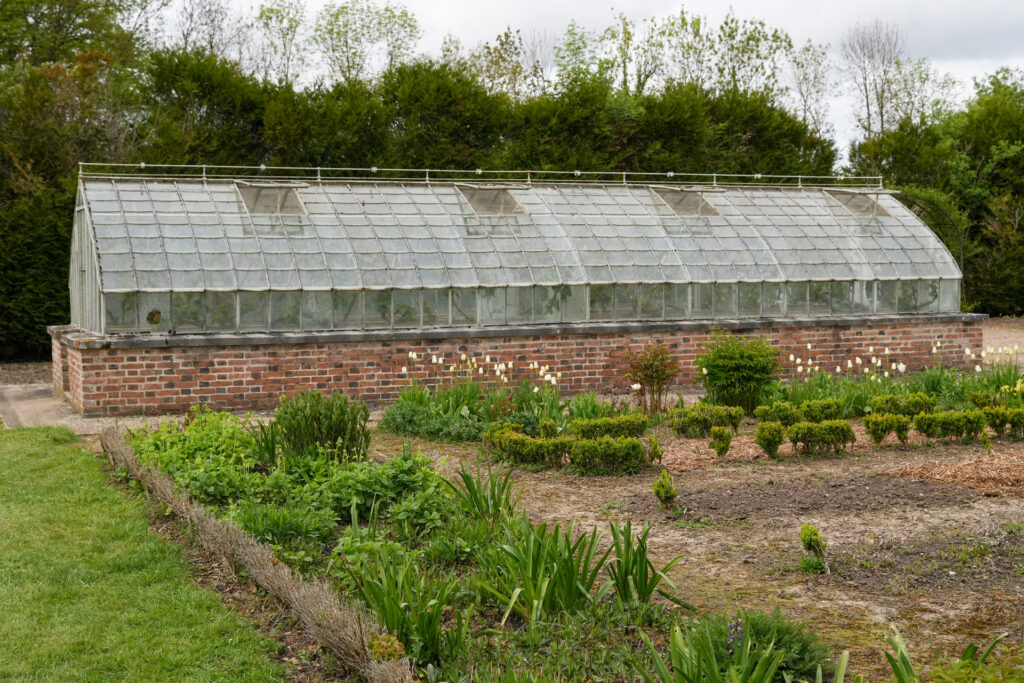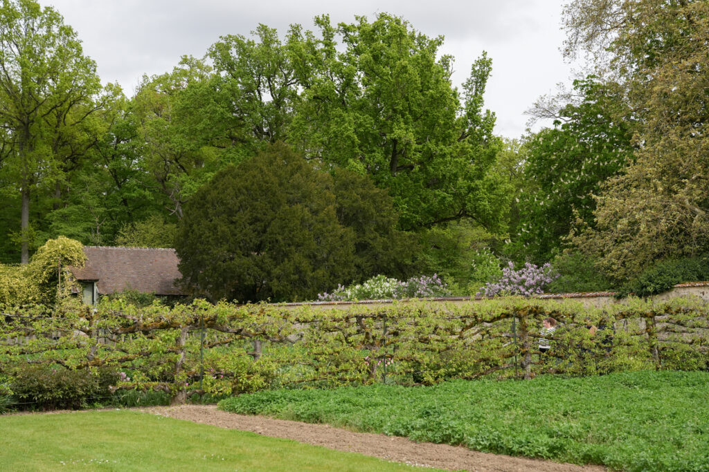 Les carrés de terre brune dominent le centre du potager tandis que les longues allées bordées de buis taillés se déploient avec une rigueur toute française, encadrées de tulipes aux pétales striées qui explosent dans toutes les nuances du rose, du corail et du blanc. Ce jardin remarquable semble vide en ce début de printemps, et pourtant, on aperçoit déjà les premières plantules qui s’éveillent à l’abri dans la serre victorienne aux vitrages blanchis. Elles sont la promesse de beaux légumes à venir. Le verger attenant est en pleine effervescence : les pommiers croulent sous leurs fleurs blanches, et certains visiteurs se sont attablés pour se reposer sous les branches, loin de la foule venue arpenter les allées du château à la recherche de plantes rares et exceptionnelles.